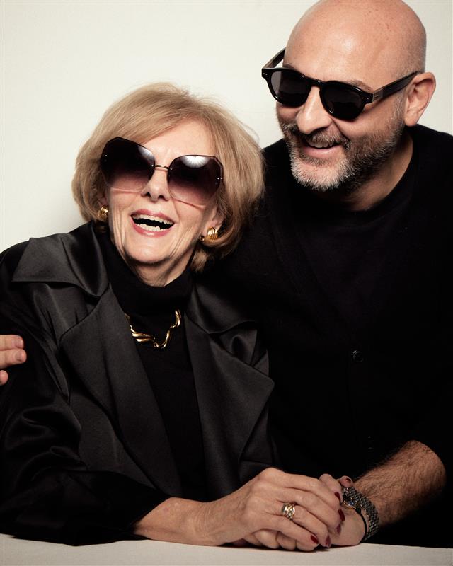 Linda Farrow, with her son Simon Jablon, Creative Director, who relaunched the brand in 2003.