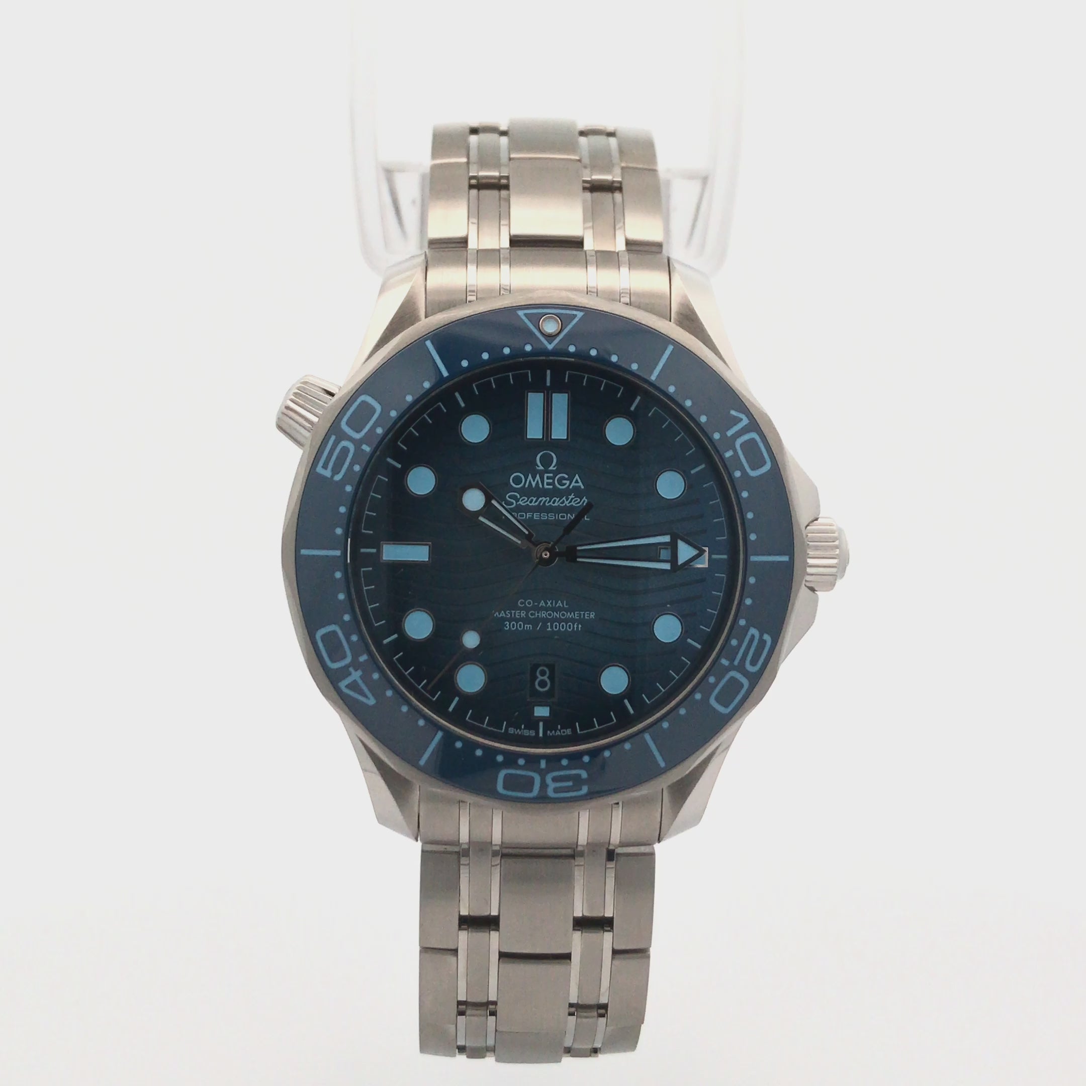 This 42 mm Seamaster Diver 300M has a case and bracelet in stainless steel. The ceramic dial, in OMEGA’s own Summer Blue, is PVD-treated and has a gradient finish to reflect the watch’s level of water resistance. It also includes the 300M’s famous wave pattern.