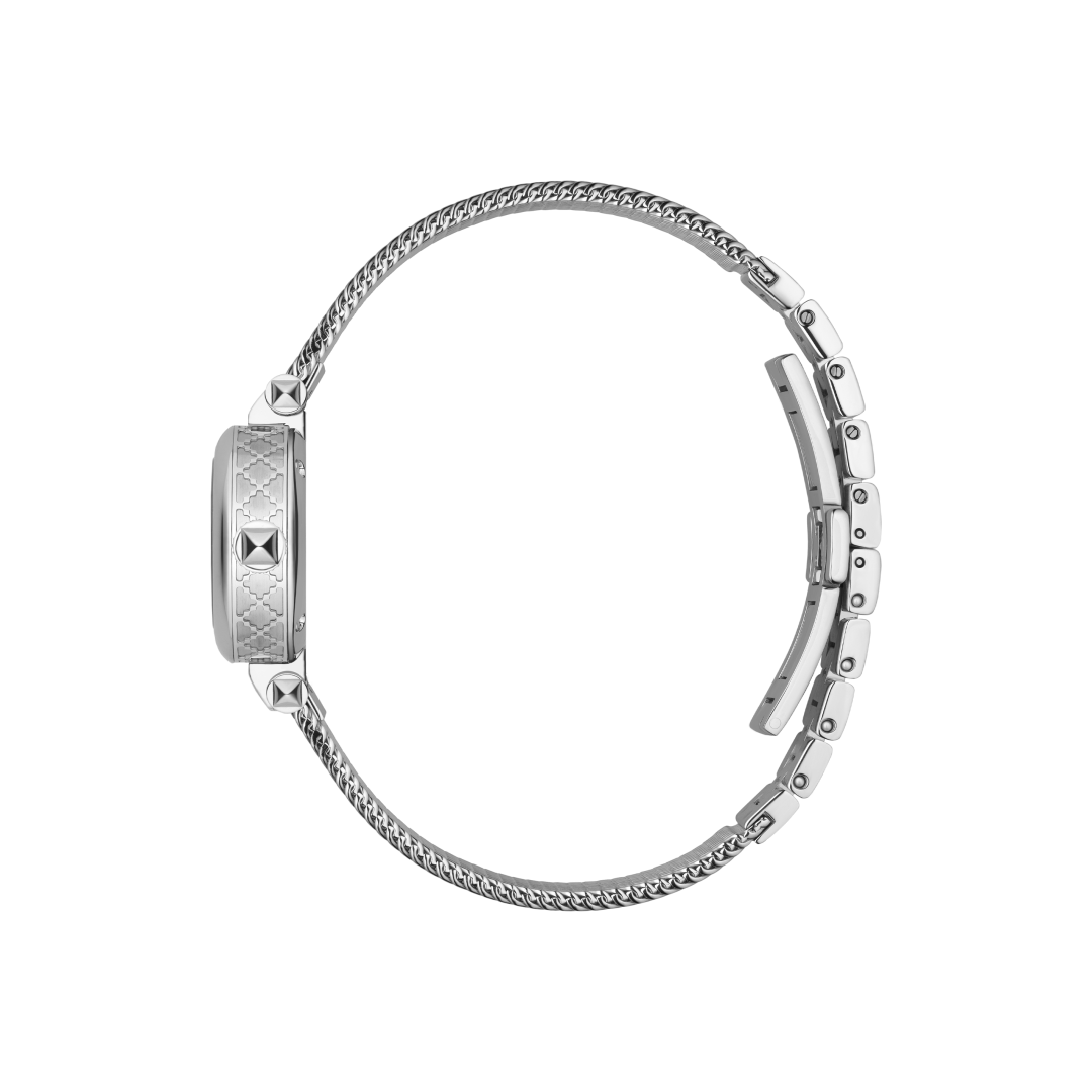 Brand New Authentic Gucci Diamantissima Mother of Pearl Diamond Dial Stainless Steel Women's Watch Model YA141512. Stainless Steel case with Stainless Steel Mesh watch band. Deployment with Push Button and Foldover clasp. Fixed bezel. Dial description: Silver tone hands and Diamond hour markers on a Mother of Pearl dial. Battery Operated Quartz movement. Watch functions: Hour, Minute. Pull and Push crown. Scratch Resistant Sapphire crystal. Round case shape. Case size: 22mm. Case thickness: 9mm. Solid case back. 50 Meters - 165 Feet water resistant. 2 year WatchMaxx warranty.