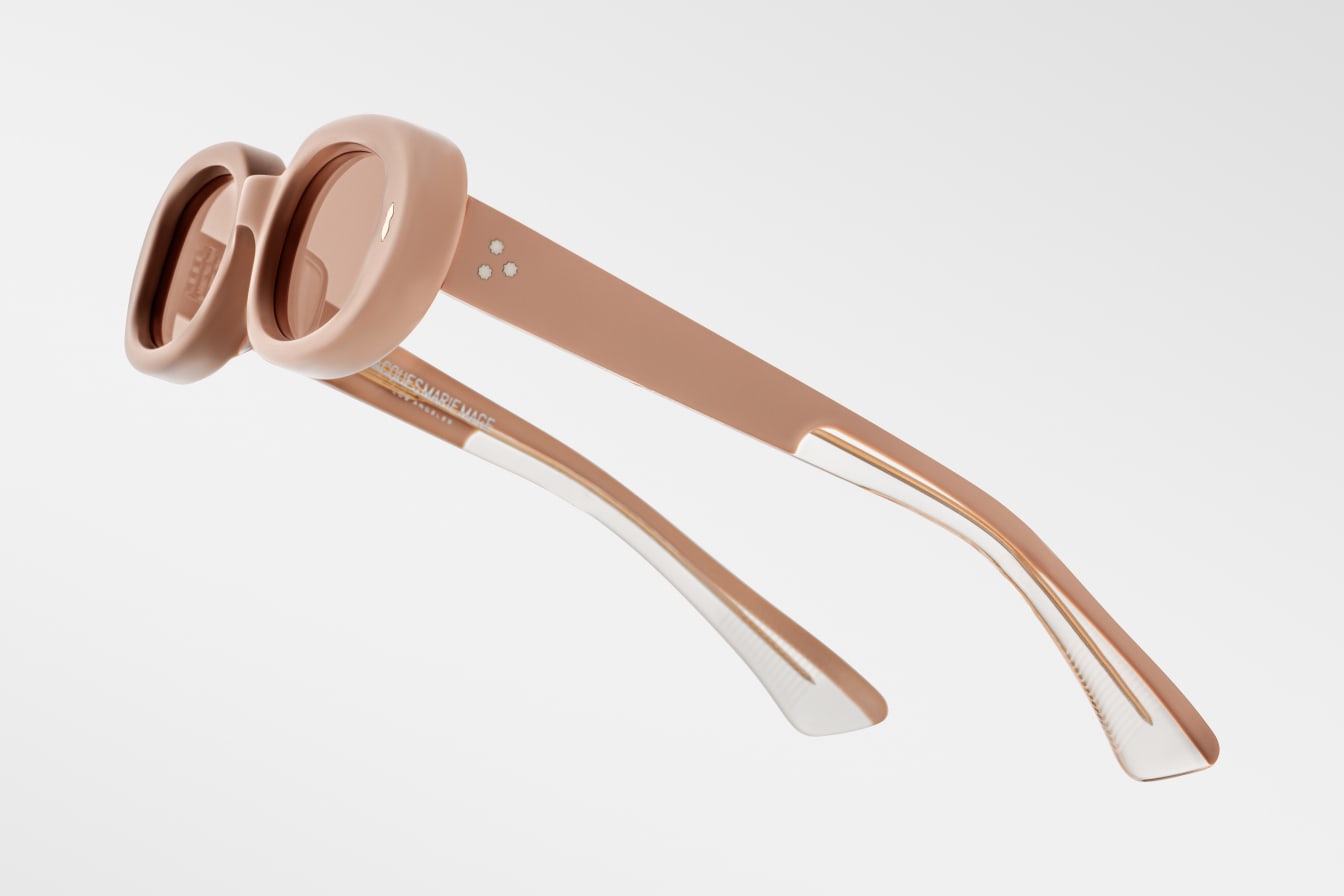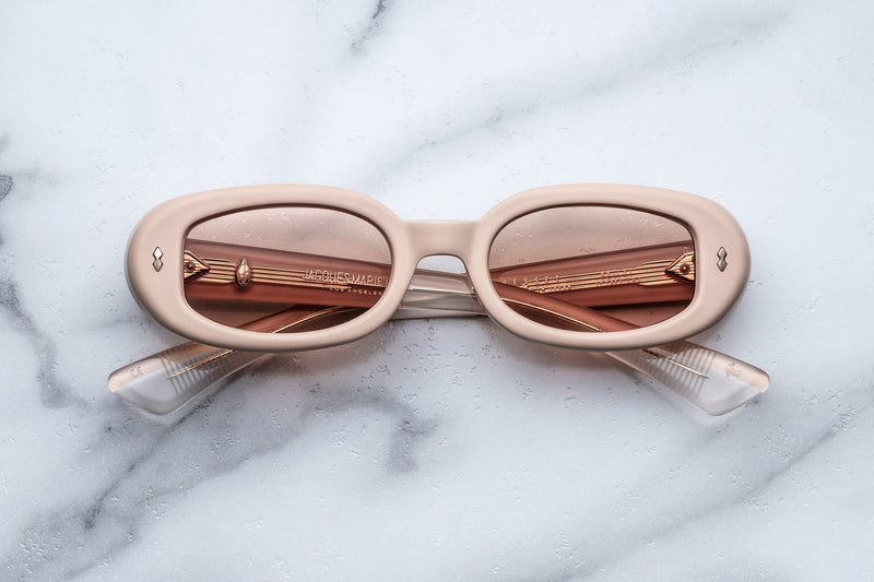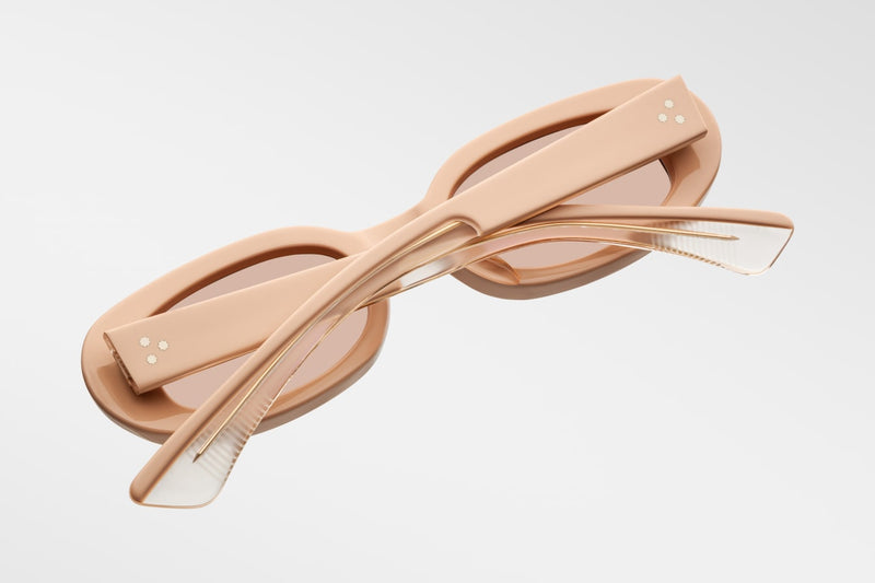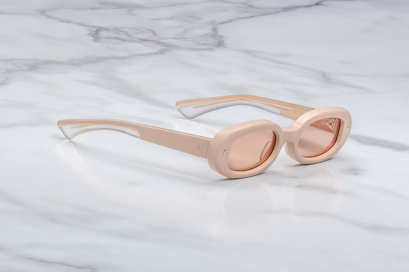 - Matte orange 8mm cured cellulose acetate frame with custom double laminated acetate temples featuring precious metal hardware and orange lenses