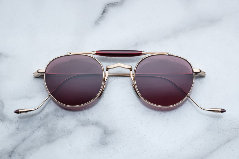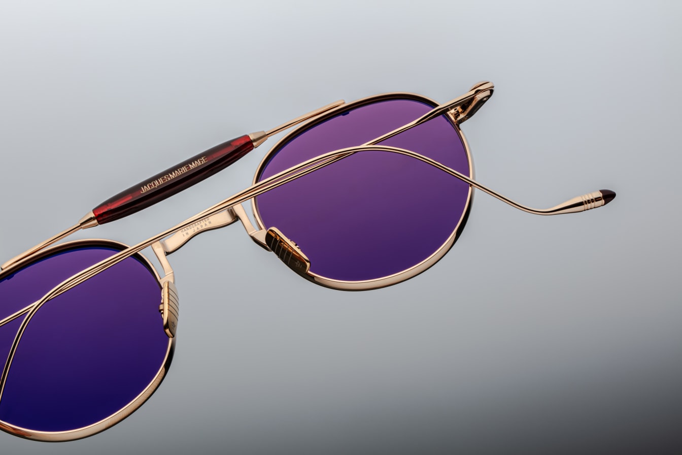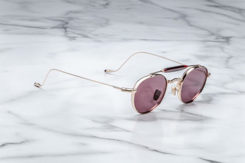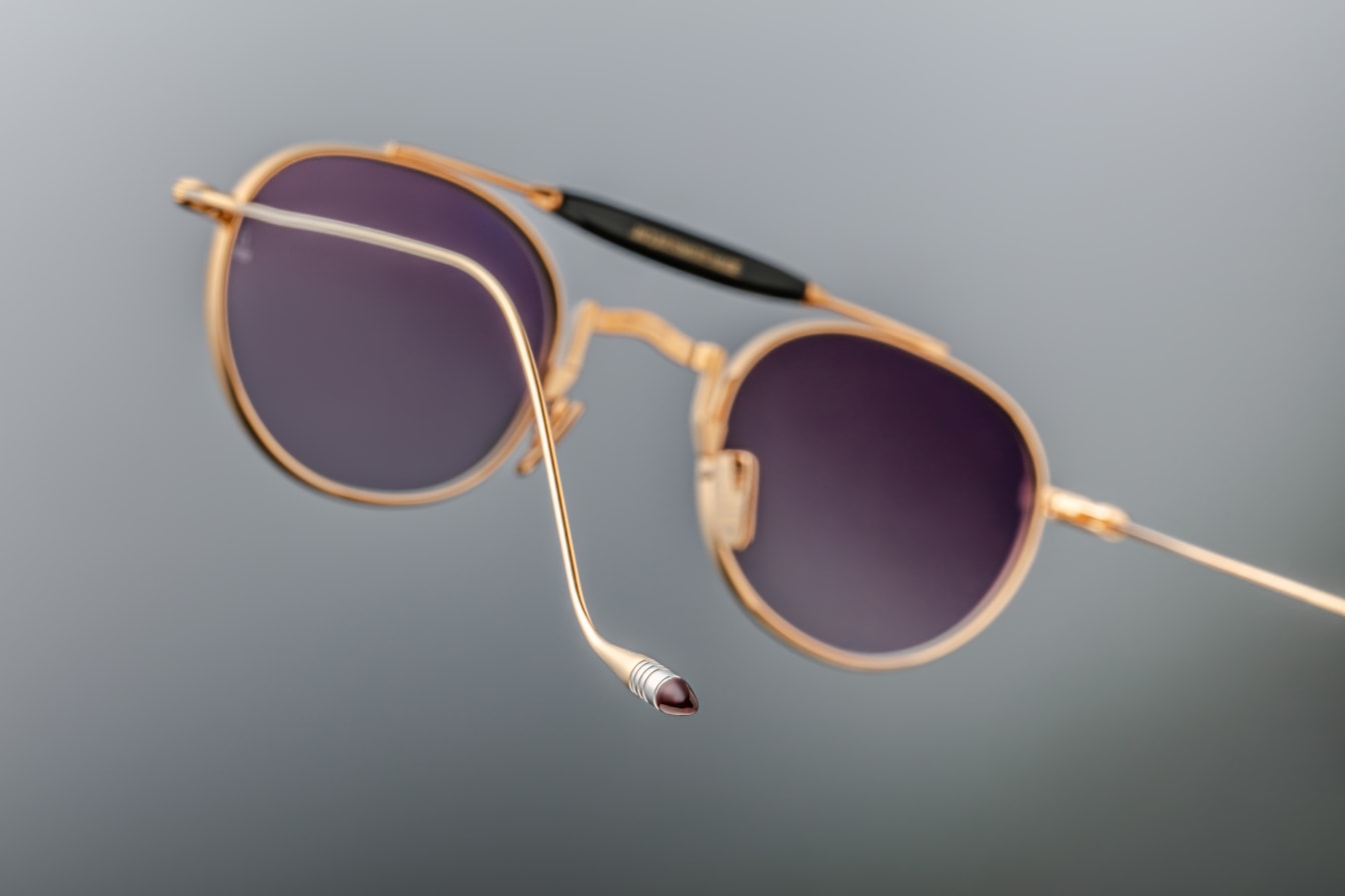 - Light gold 100% beta titanium frame with black cured cellulose acetate bridge accent and purple lenses