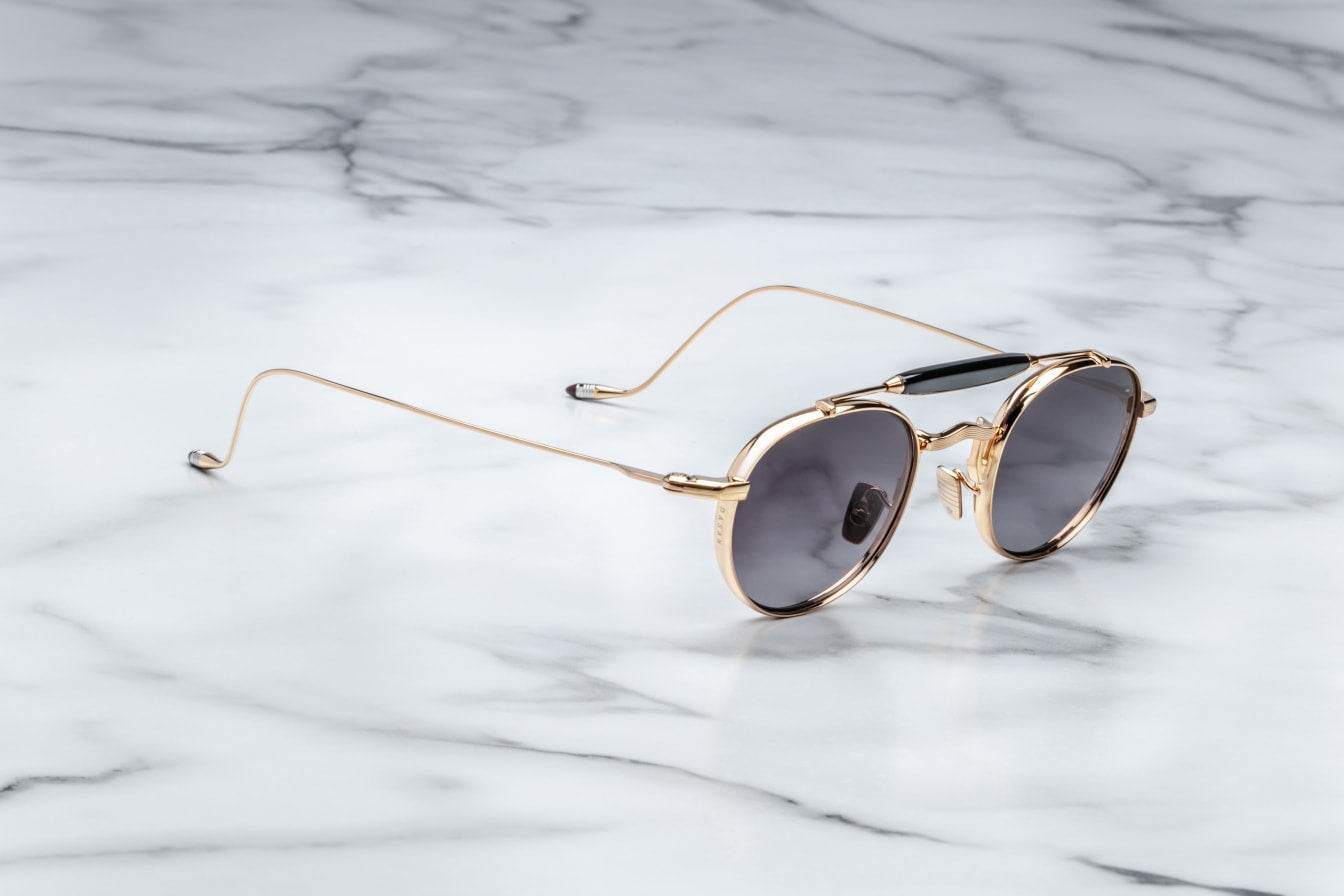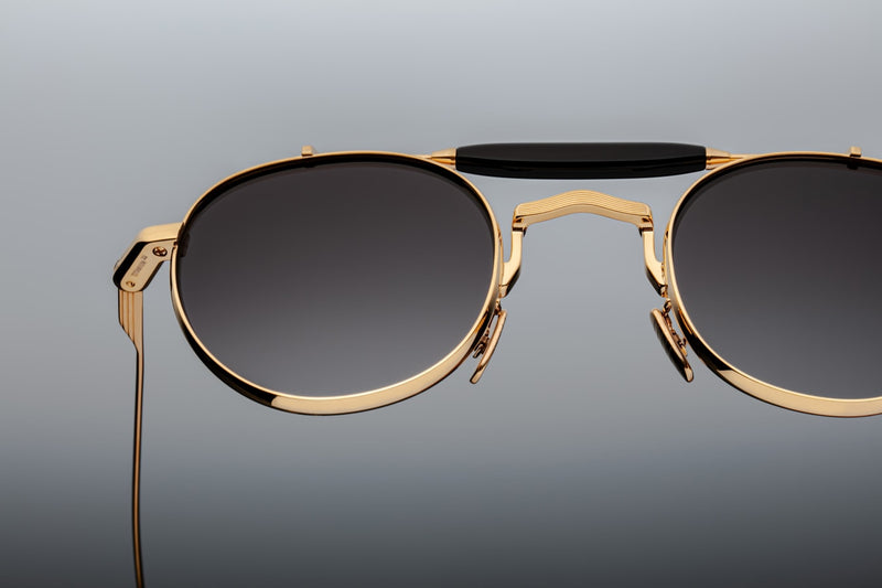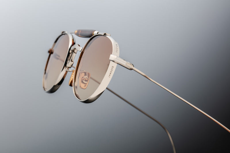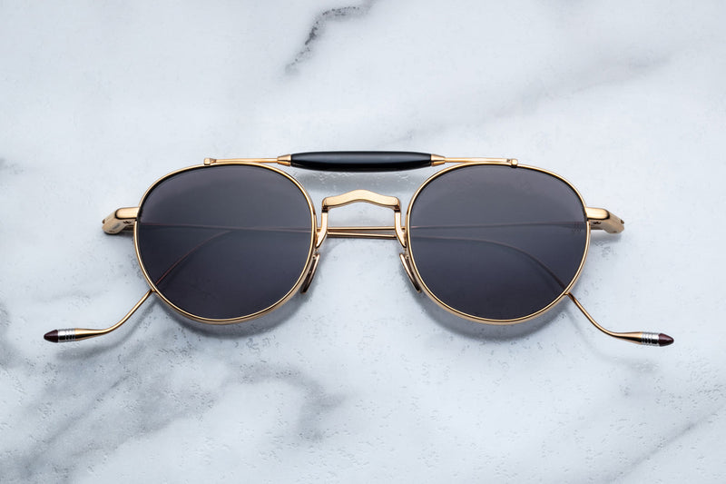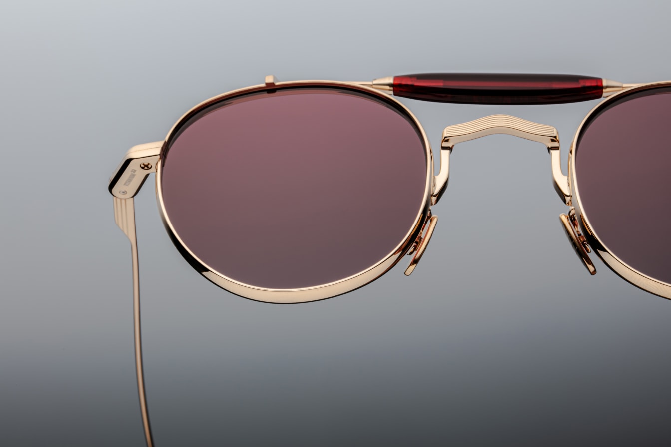 - Light gold 100% beta titanium frame with black cured cellulose acetate bridge accent and purple lenses