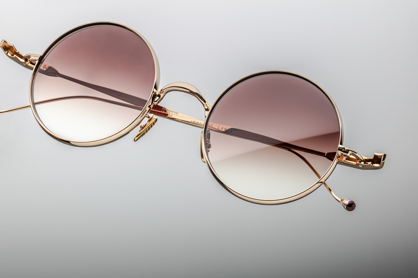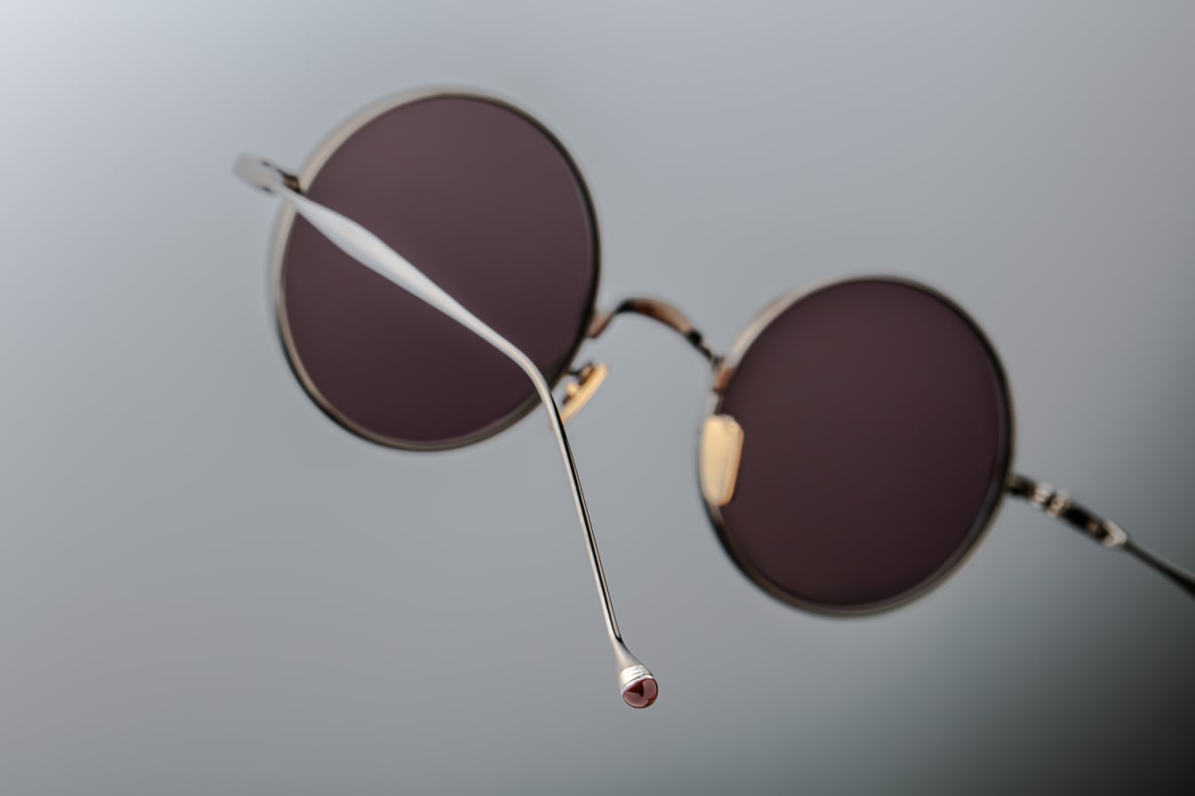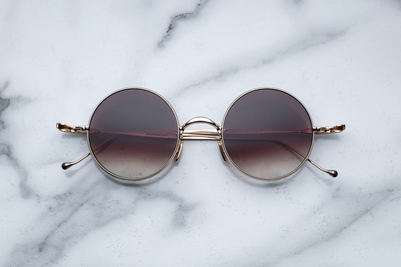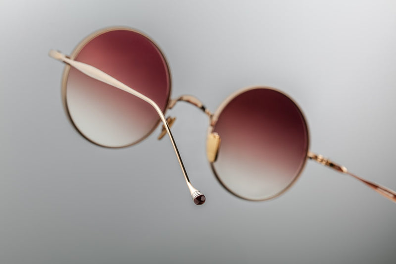 - Custom light gold hidden hinge with burgundy epoxy temple tips
