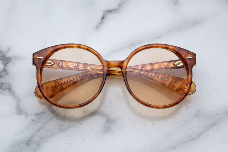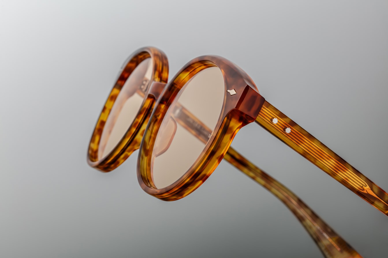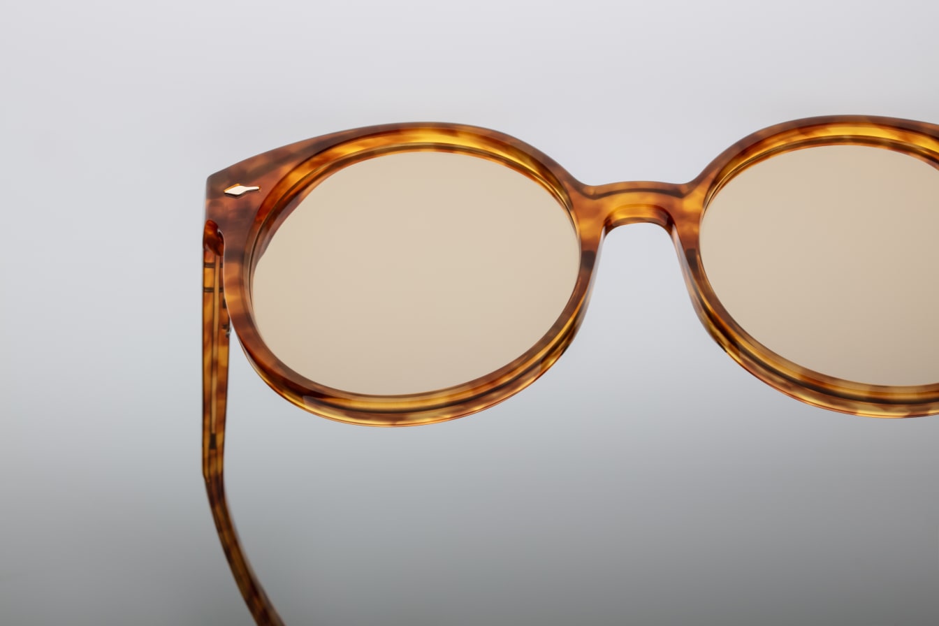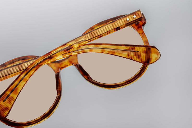 - Havana 10mm cured cellulose acetate frame with custom double laminated acetate temples featuring precious metal hardware and yellow lenses