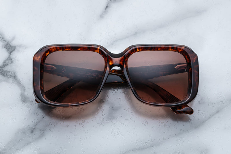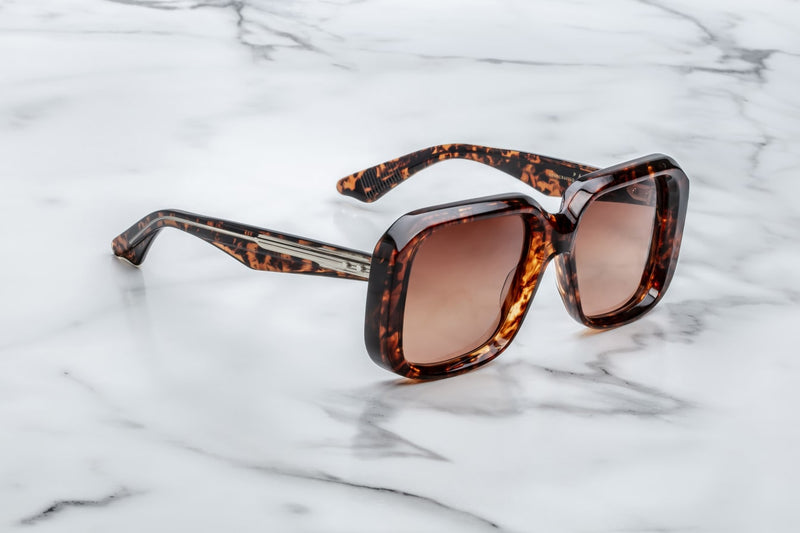 - Brown 10mm cured cellulose acetate frame with custom double laminated temples featuring precious metal hardware and brown gradient lenses