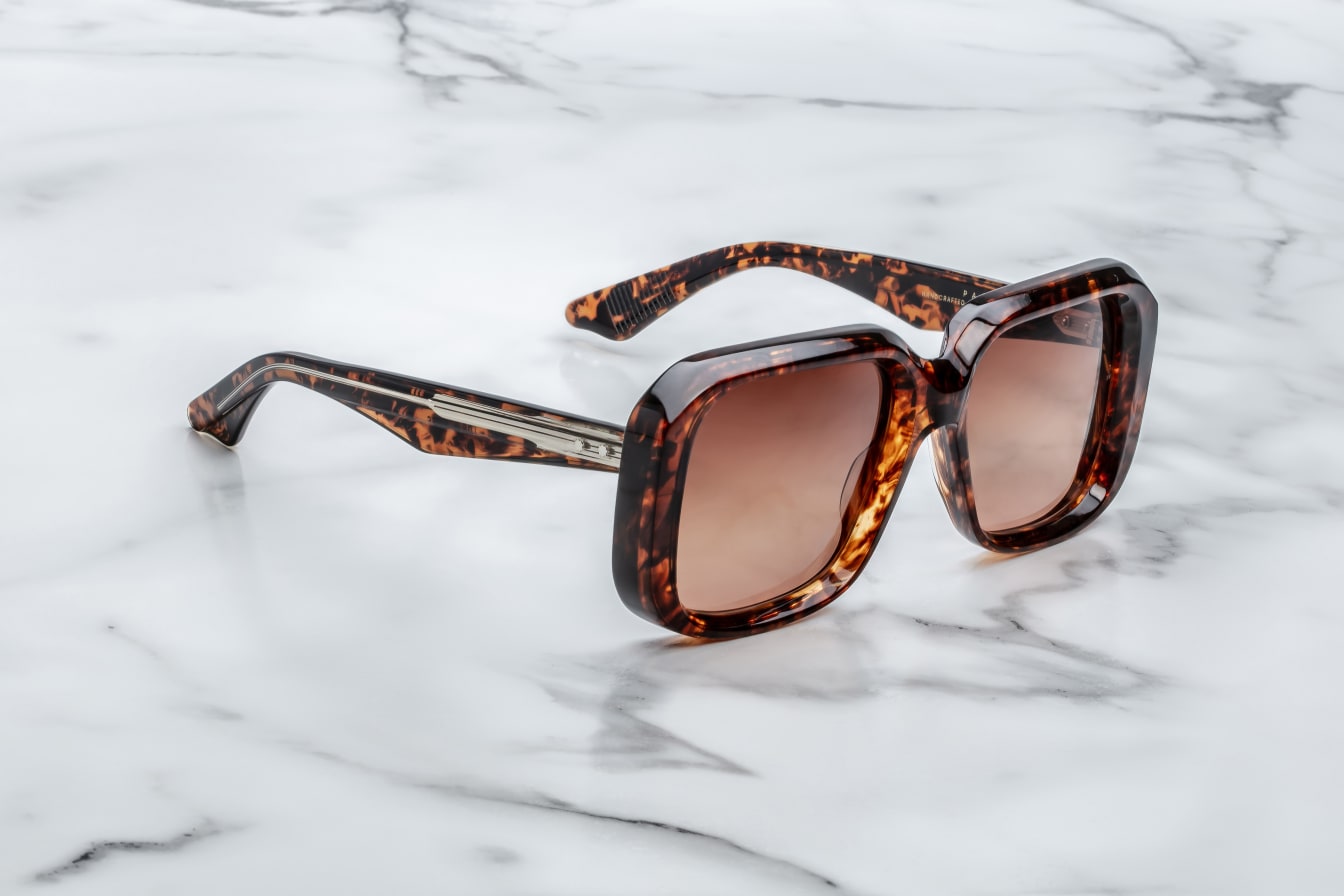 • Brown 10mm cured cellulose acetate frame with custom double laminated temples featuring precious metal hardware and brown gradient lenses