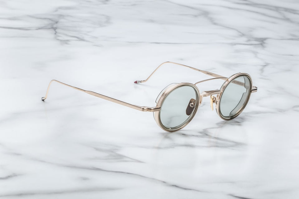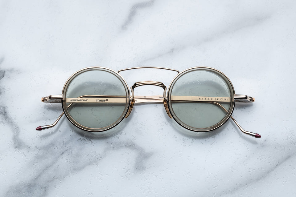 • Custom light gold hairline hinge and burgundy epoxy temple tip