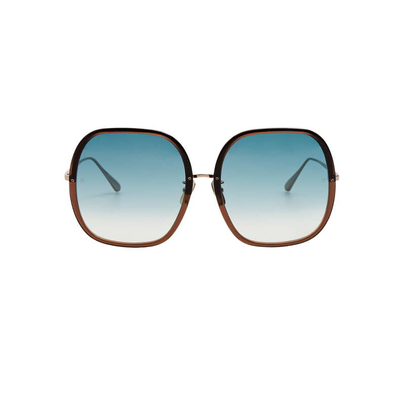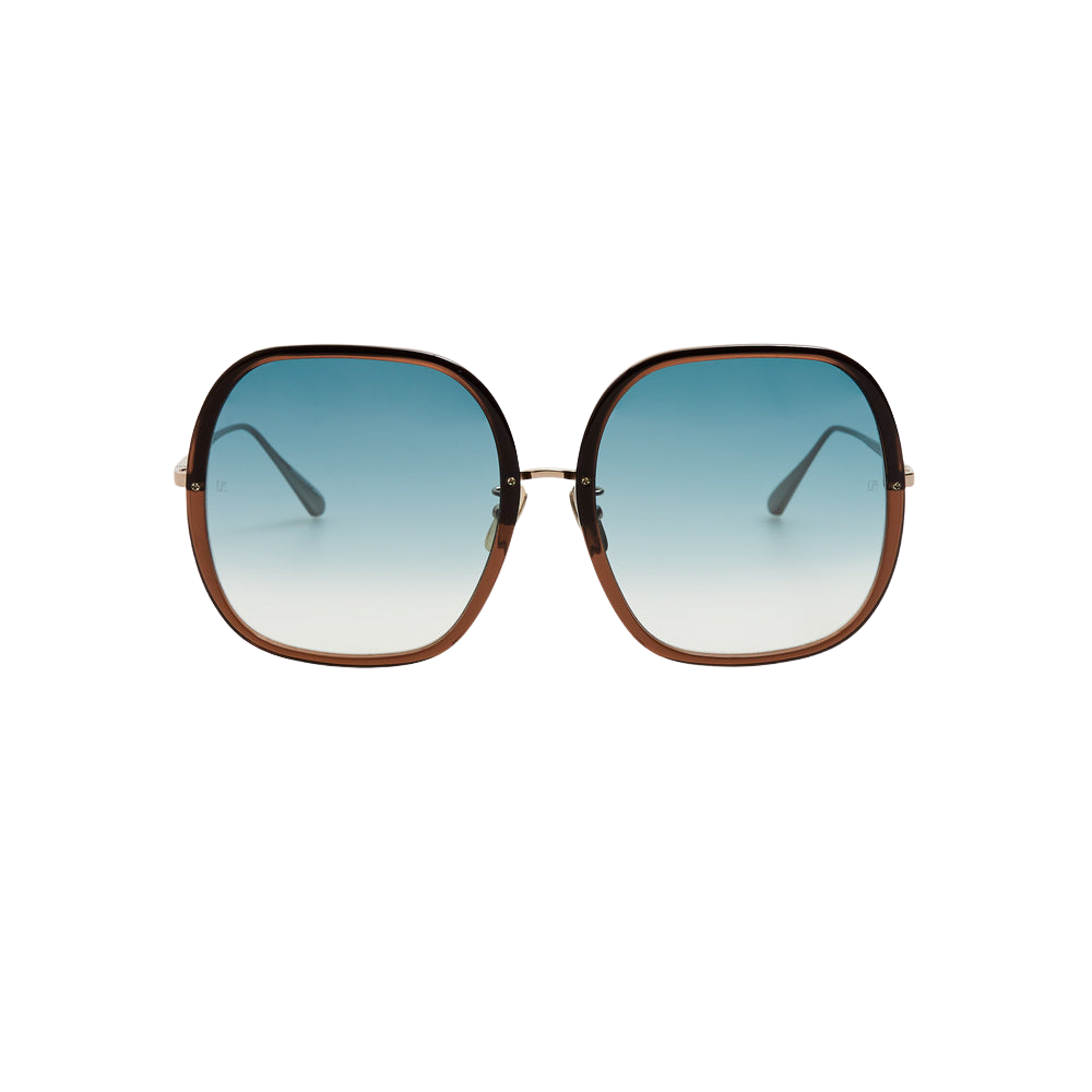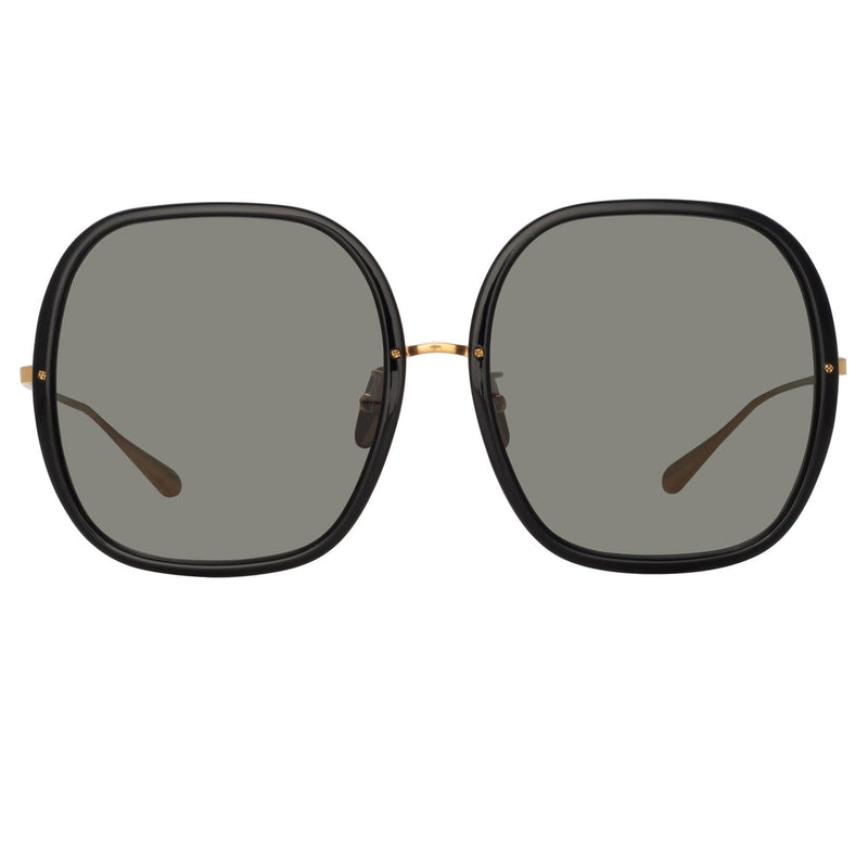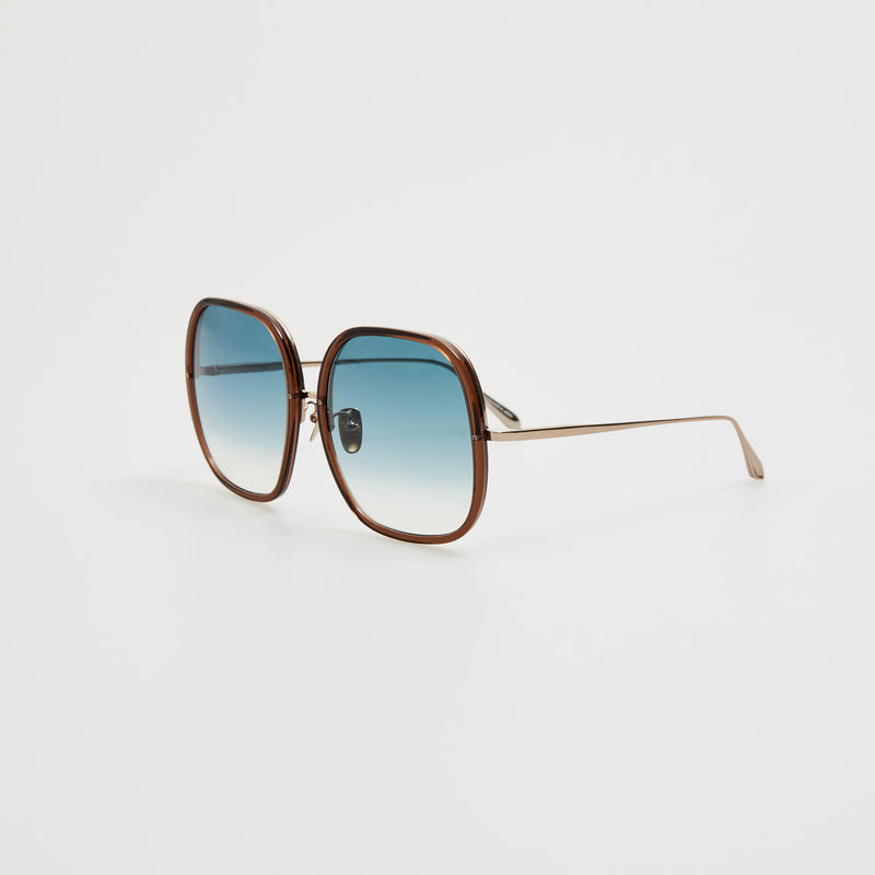 The Celia Oversized Sunglasses is finely sculpted translucent black acetate rims are mounted onto a 22-carat yellow gold plated titanium frame work which runs along the inner brow and transitions to sleek tapered temples.