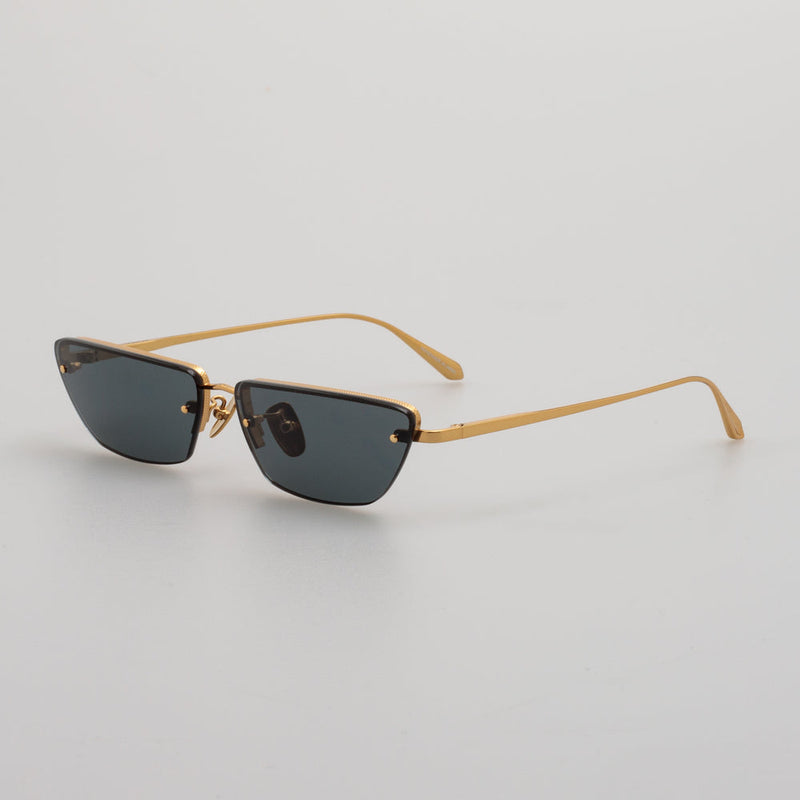 The classic cat-eye silhouette is redefined with a modern twist in the Cleo Cat Eye Sunglasses. Featuring luxurious yellow-gold titanium frames and paired with minimalist grey lenses, this design offers a refined yet effortless take on summer style.
