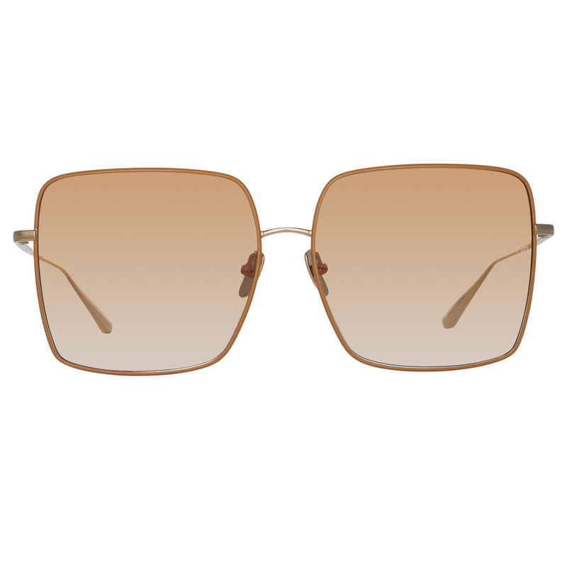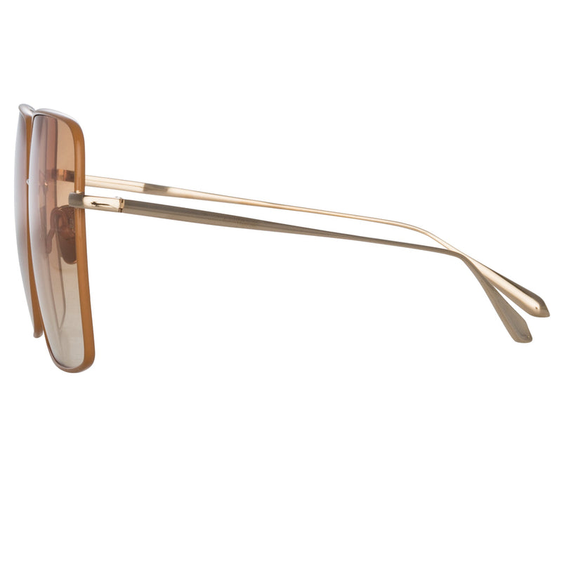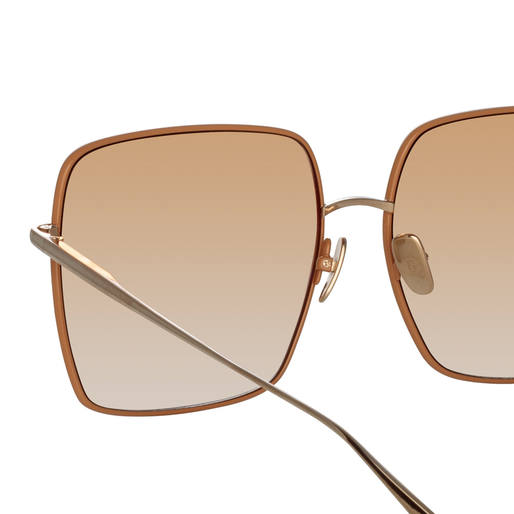 Introducing the Hina sunglasses. Spun from pure Japanese titanium the light gold plated sunglasses are partially encircled by a contrasting tobacco rim which forms its silhouette.