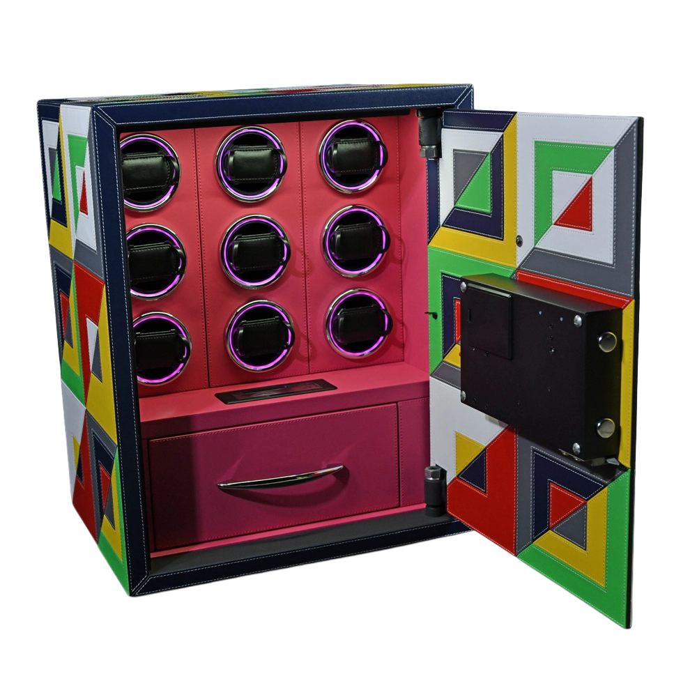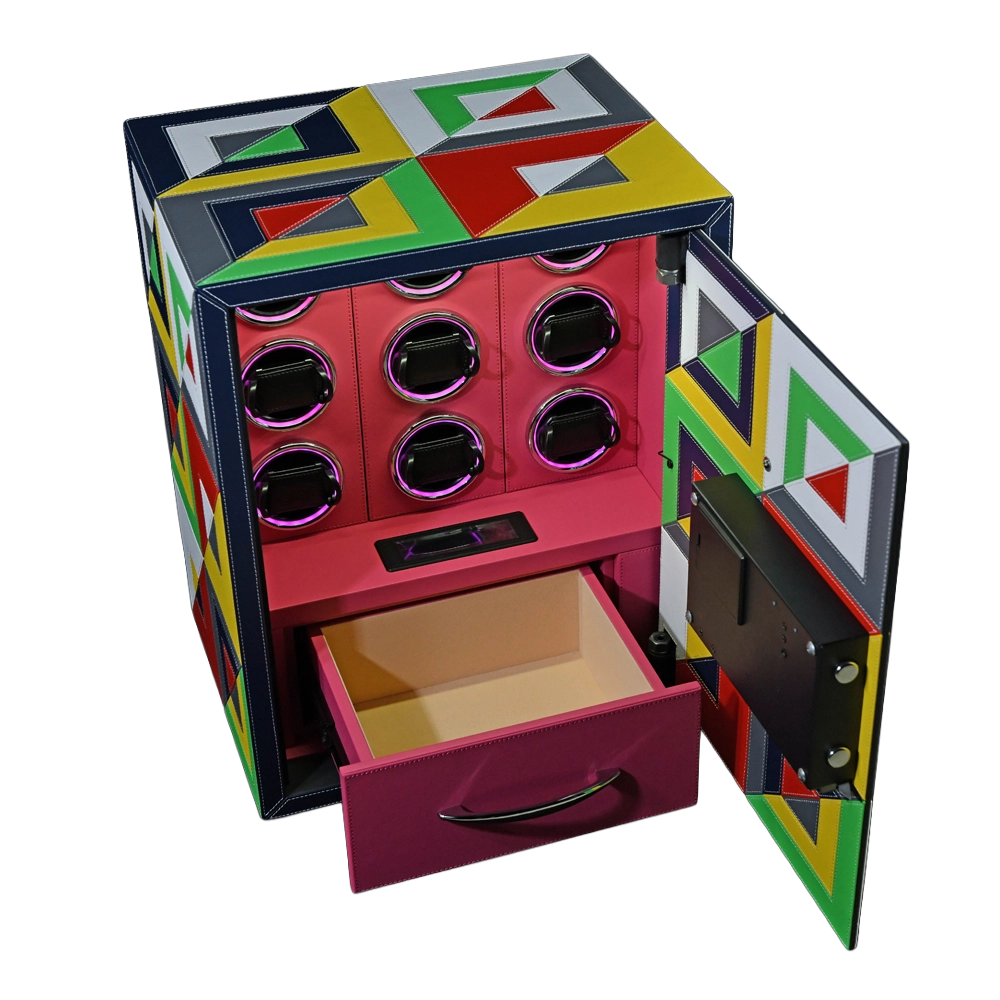 Mosaic Multicolor Storage Watch Winder Safe – Protect, store, and elegantly display your luxury timepieces with this premium watch winder safe, crafted for collectors who value security, precision, and refined presentation. Made with a vibrant multicolor leather exterior, it features advanced fingerprint and numeric password locks for maximum protection.
