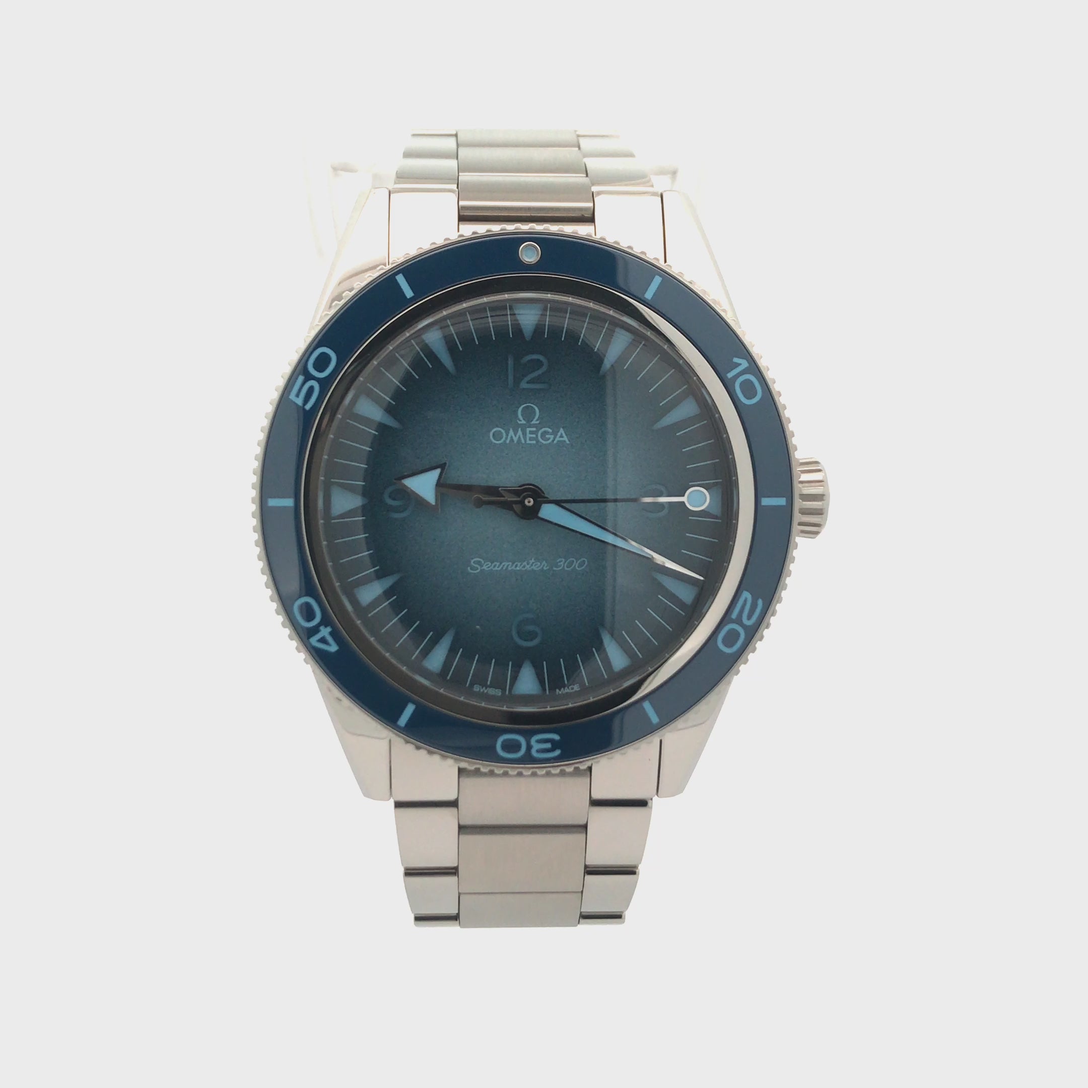 The varnished dial, in OMEGA’s own Summer Blue, has a gradient finish to reflect the watch’s level of water resistance. In keeping with the colour code, OMEGA has filled the rhodium-plated hands, recessed hour markers, and open numerals with a unique light blue Super-LumiNova.